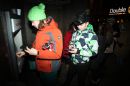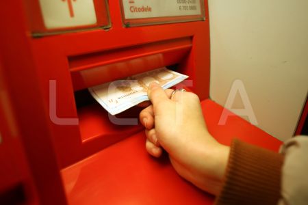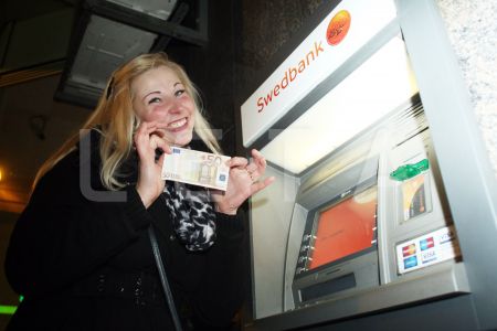 Cilvēki ar izņemtajā, eiro banknotēm no "Swedbank" bankomāta pēc ...