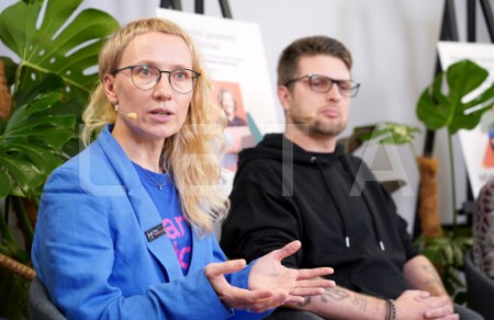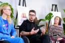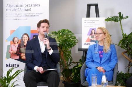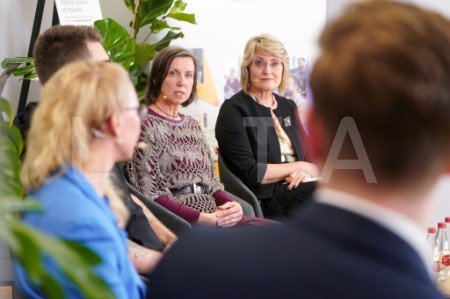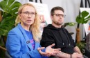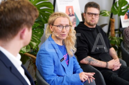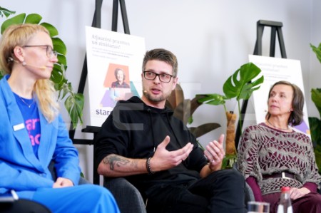 Diskusijas moderators Mārtiņš Spuris un "Riga TechGirls" vadītāja ...