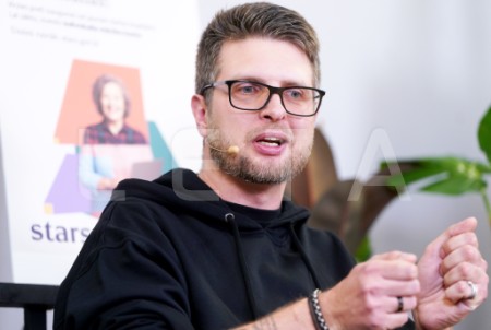 Diskusijas moderators Mārtiņš Spuris, "Riga TechGirls" vadītāja Anna ...