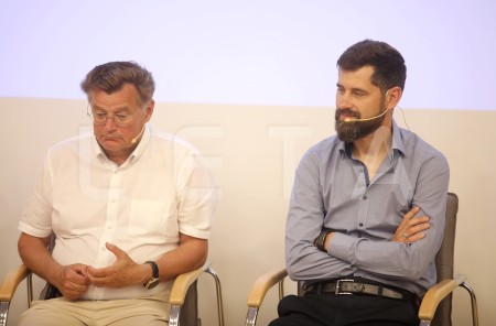 Pasākuma moderators Haralds Burkovskis (no kreisās) un biedrības ...