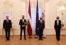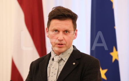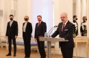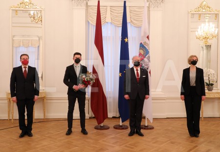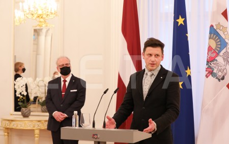 Valsts prezidents Egils Levits (no kreisās) un monētas "Satversmei ...