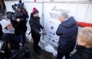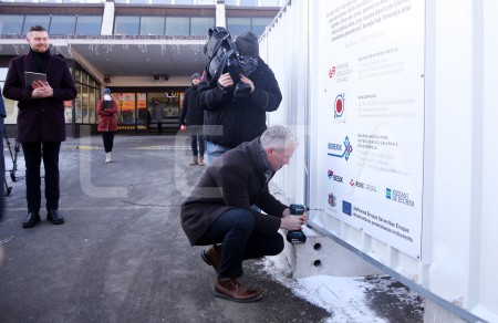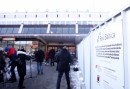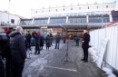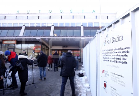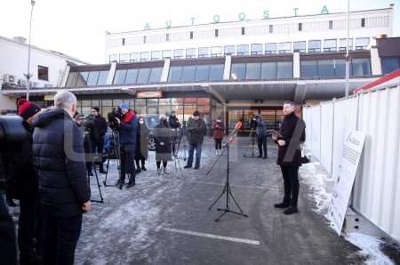 Pie ieejas Rīgas autoostā notiek preses konference, kurā informē par ...