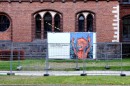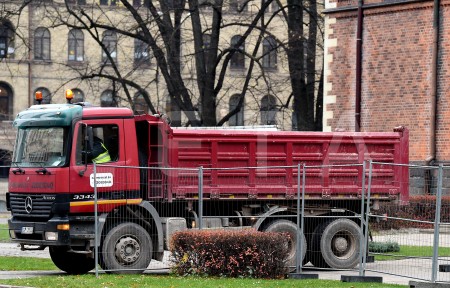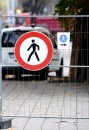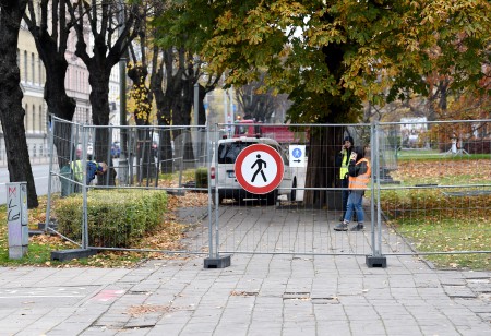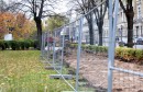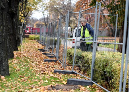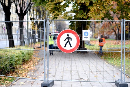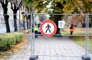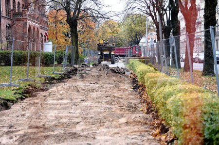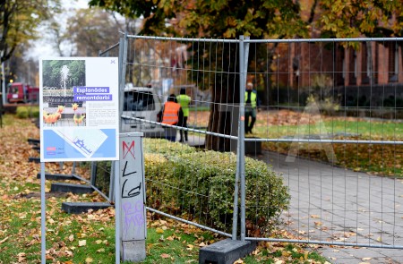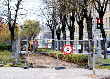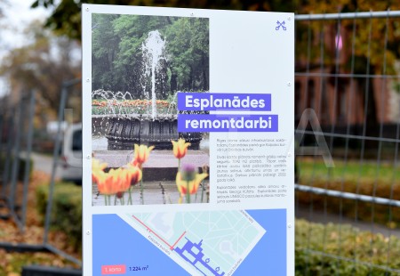 Nožogojums Esplanādē, kur tiek sākti gājēju celiņu bruģa atjaunošanas ...