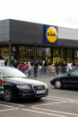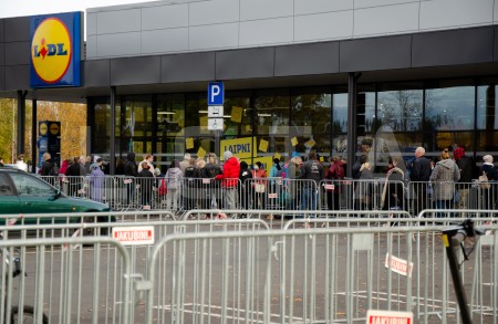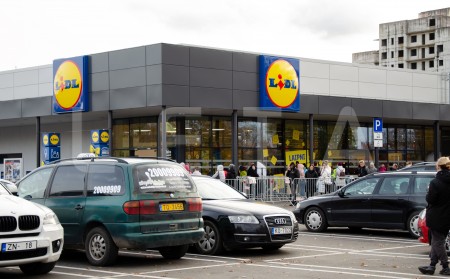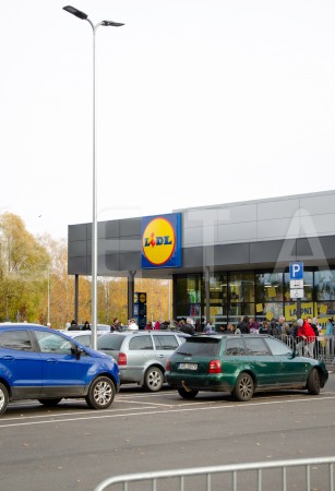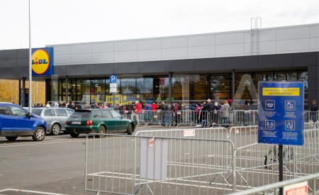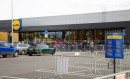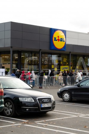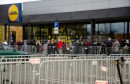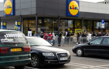 Cilvēku rinda pie "Lidl" veikala Jelgavā.
