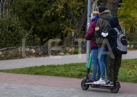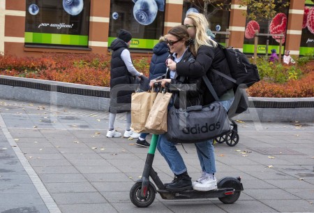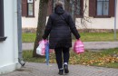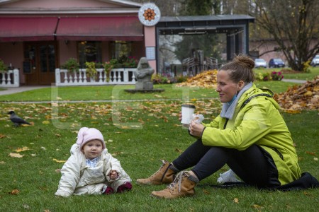 Sieviete ar bērnu pie kafejnīcas Ogrē Covid-19 pandēmijas laikā, kad ...