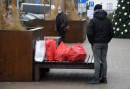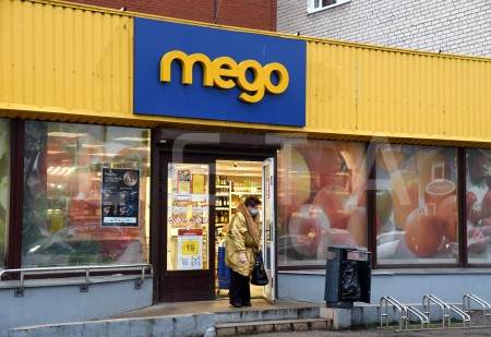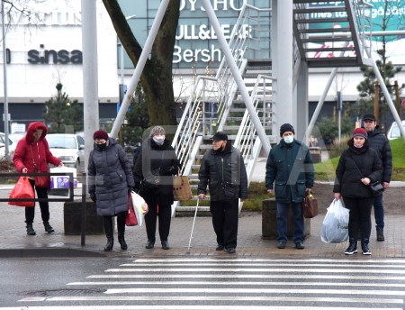 Cilvēki ar iepirkuma maisiņiem pie tirdzniecības centra "Alfa" pirms ...