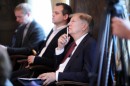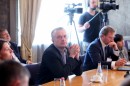 "SSE Riga" profesors Arnis Sauka (no kreisās) piedalās pasākumā, kurā ...
