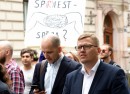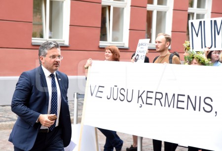 Saeimas deputāts Atis Lejiņš pie Saeimas nama, kur notiek protesta ...