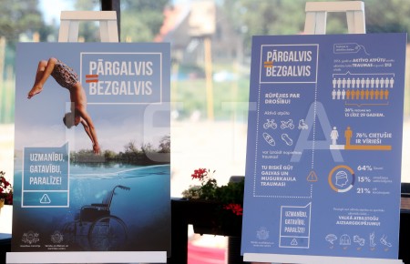 Pēc lēciena ūdenī traumu guvušais Guntars Skrabis (no kreisās), ...