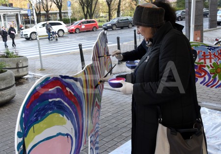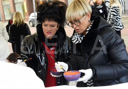Māksliniece Elita Patmalnice (no labās) un Rīgas Austrumu klīniskā ...