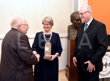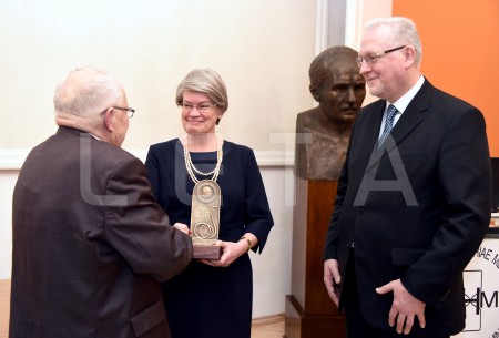 Akadēmiķis Jānis Stradiņš (no kreisās) pasniedz Paula Stradiņa balvu ...