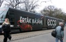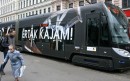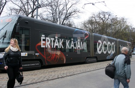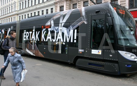 Reklāma "Ērtāk kājām!" uz tramvaja.