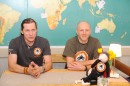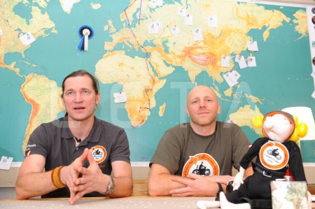 Ceļotāji Mārtiņš Sils (no kreisās) un Andžs Ūbelis piedalās preses ...