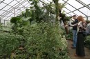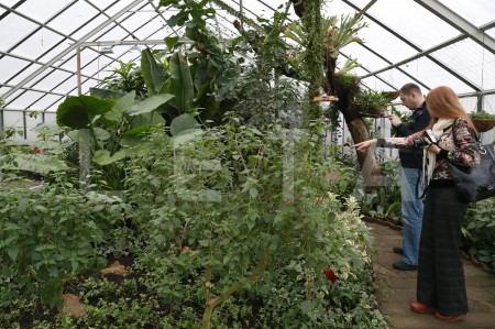 Apmeklētāji Latvijas Universitātes Botāniskā dārza tropu tauriņu mājā.