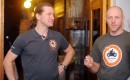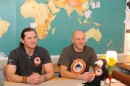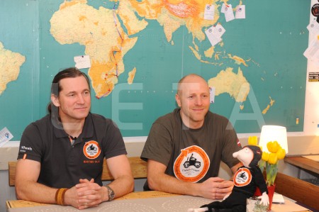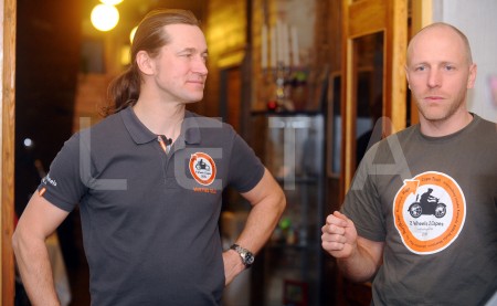 Ceļotāji Mārtiņš Sils (no kreisās) un Andžs Ūbelis piedalās preses ...
