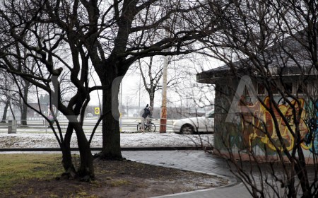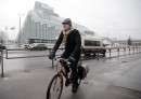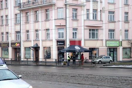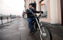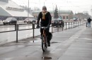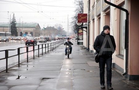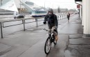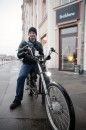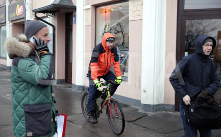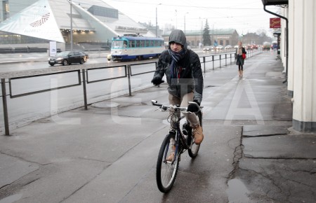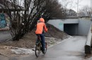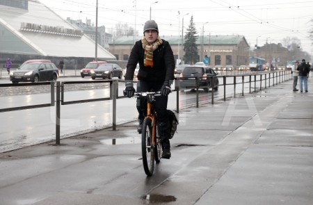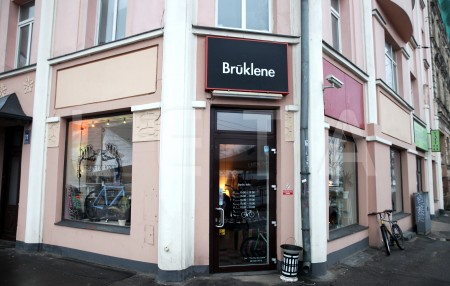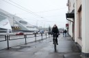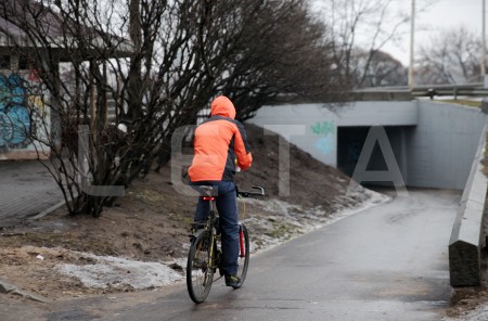 Riteņbraucējs Uzvaras bulvārī pie velodzīvesveida veikala "Brūklene".