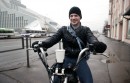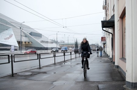 Riteņbraucēja Uzvaras bulvārī pie velodzīvesveida veikala "Brūklene".