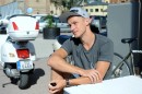 Vīrietis ar cepuri tveicīgajā vasaras dienā jūrmalā pie Mangaļsalas.