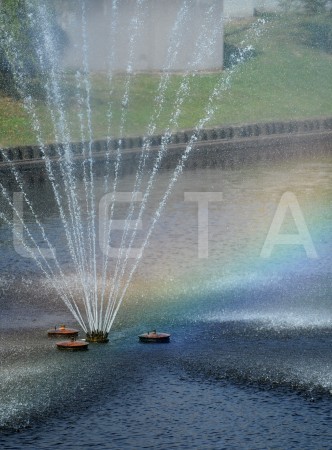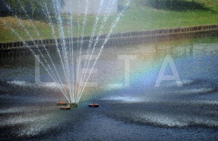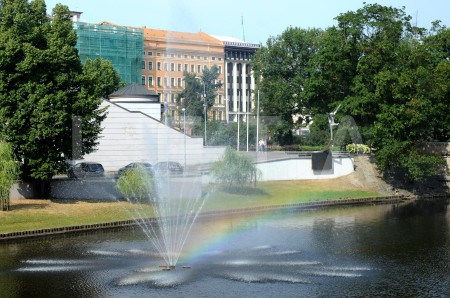 Varavīksne un strūklaka Rīgas kanālā pie Latvijas Nacionālās operas.
