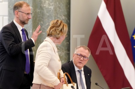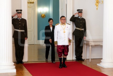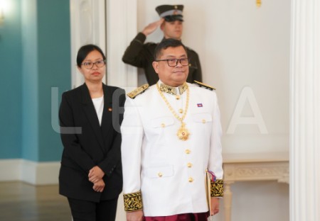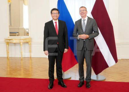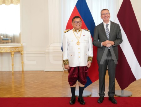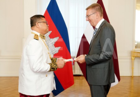 Kambodžas vēstnieks Latvijā Ķea Ķanboribo (priekšplānā) akreditācijas ...