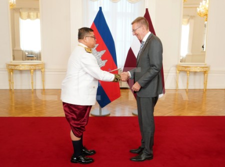 Kambodžas vēstnieks Latvijā Ķea Ķanboribo (centrā) akreditācijas ...