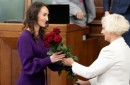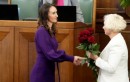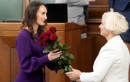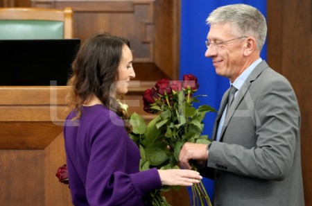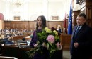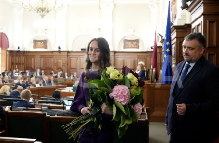 Jaunievēlētā tiesībsardze Karina Palova saņem ziedus Saeimas sēdes ...