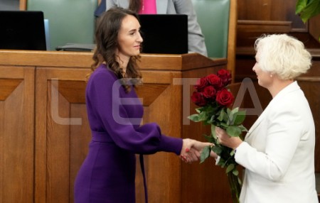 Saeimas priekšsēdētāja Daiga Mieriņa (no labās) pasniedz ziedus ...