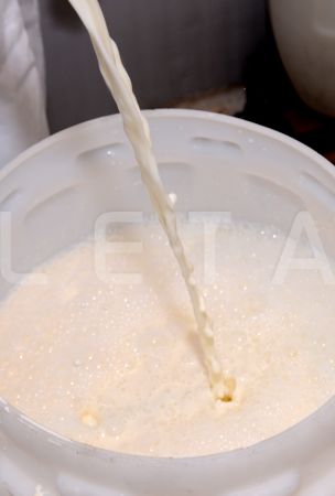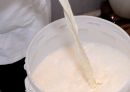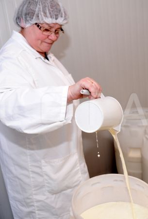 SIA "Saldus pārtikas kombināta" darbiniece lej mucā pienu.