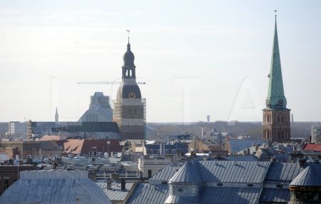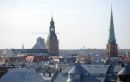 Panorāma ar baznīcu torņiem un Vecrīgas namu jumtiem.