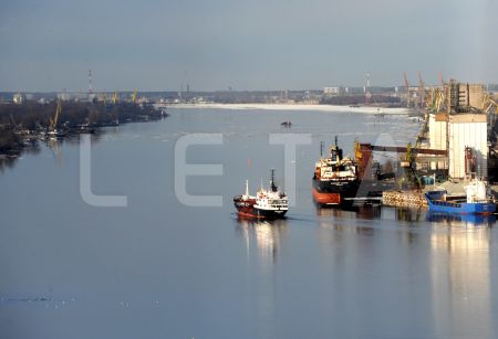 Skats no "Swedbank" administratīvās ēkas uz Daugavu un kuģiem ostā.