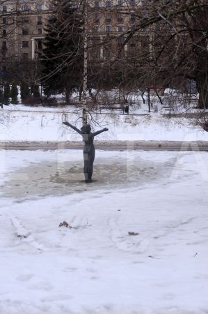 Meitenes skulptūra sniegā skvērā pie Latvijas Universitātes.