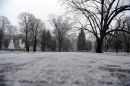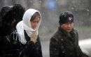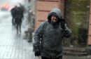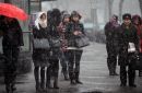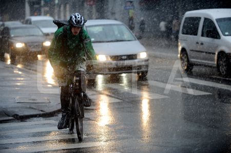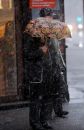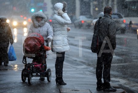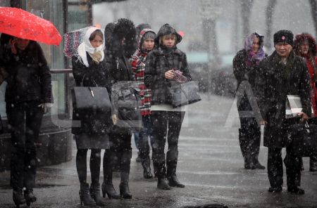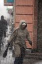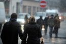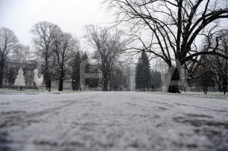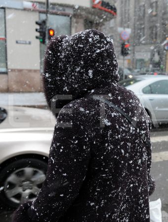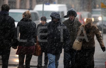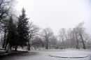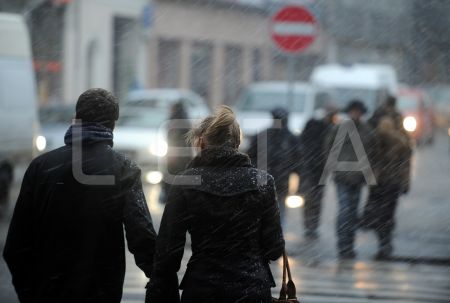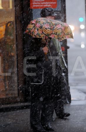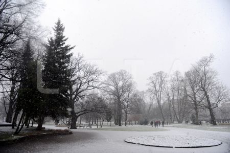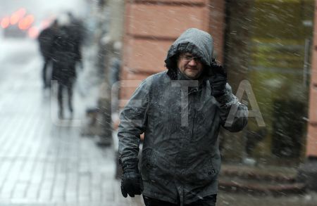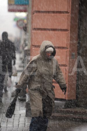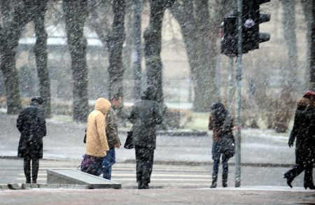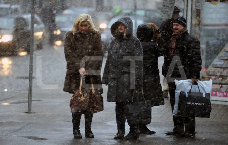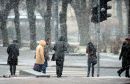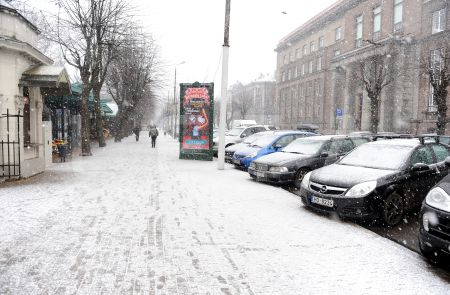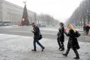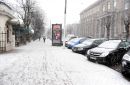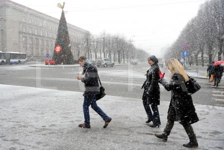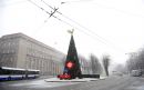 Ziemassvētku egle Brīvības ielā un Ministru kabineta ēka sniegputenī.
