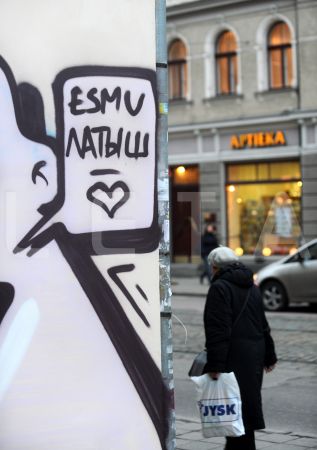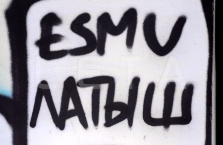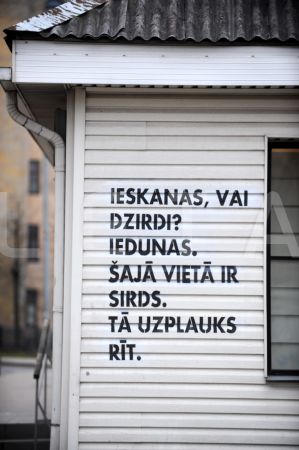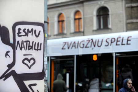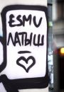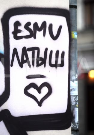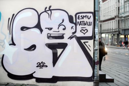 Grafiti ar uzrakstu "Esmu latvietis!" uz ēkas sienas Krišjāņa Barona ...