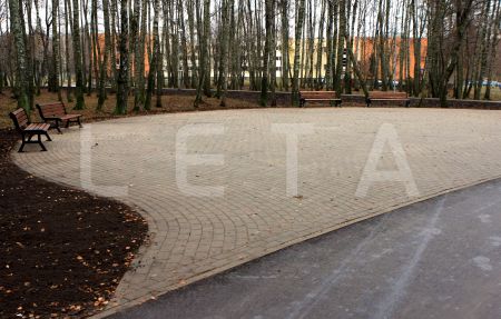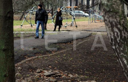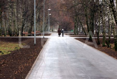 Gājēju celiņš un soliņi Pļavnieku bērzu birzs daļā, kuru labiekārtos ...
