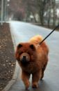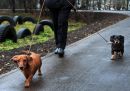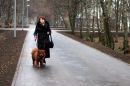 Sieviete ar suni labiekārtotajā Pļavnieku bērzu birzī.