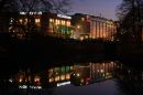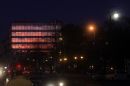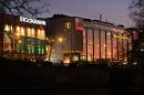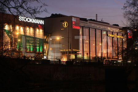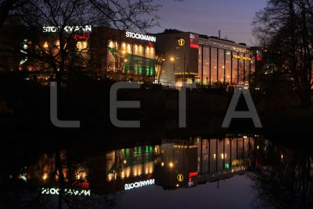 Universālveikala "Stockmann" un kinoteātra "Forum Cinemas" ēka vakarā.