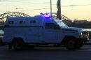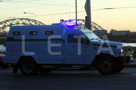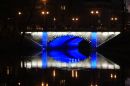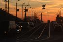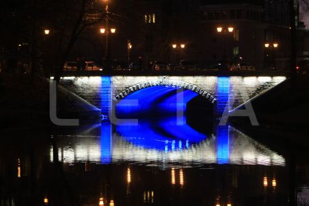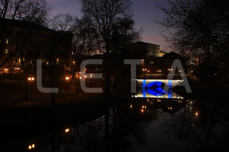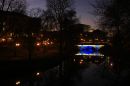 Laternas un vadi uz Akmens tilta vakara stundā.