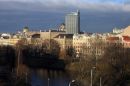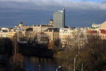 Skats uz ēkām Raiņa bulvārī un viesnīcu "Radisson Blu Hotel Latvija".