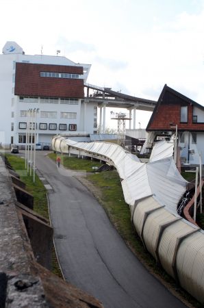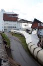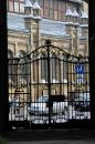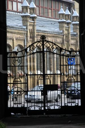 Skats uz Vidzemes tirgus ēku caur metāla vārtiem.