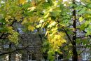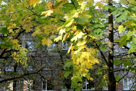 Dzeltenas un zaļas kļavu lapas.