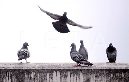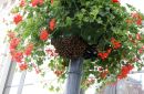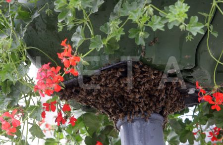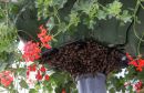 Bišu spiets pie laternas staba piestiprinātajā puķu podā līdzās ...