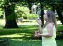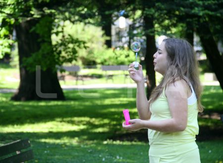 Meitene pūš ziepju burbuļus.