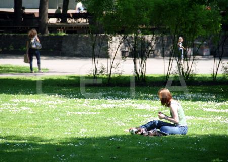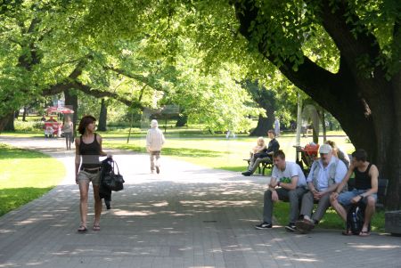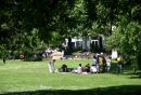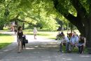 Cilvēki koka ēnā Vērmanes dārzā.