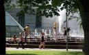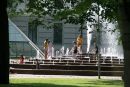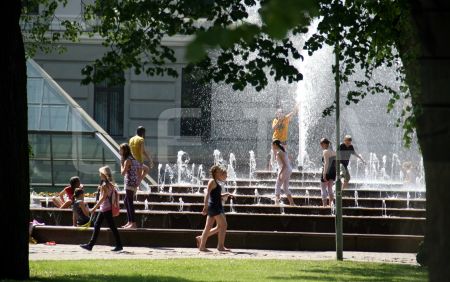 Bērni karstajā dienā Kongresu nama strūklakā.