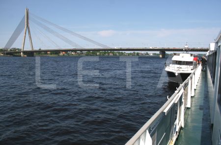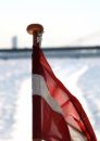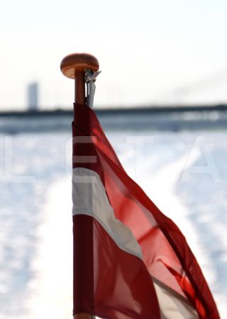 Latvijas karogs kuģa aizmugurē.