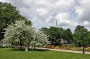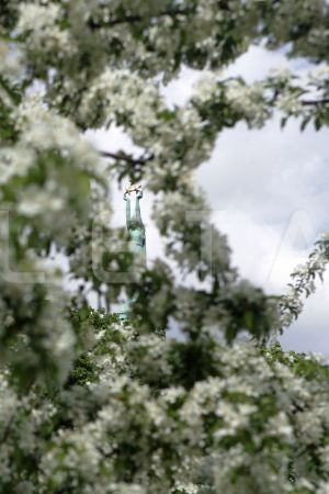 Ziedoša ābele pilsētas kanāla apstādījumos un Brīvības piemineklis.