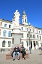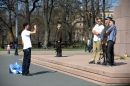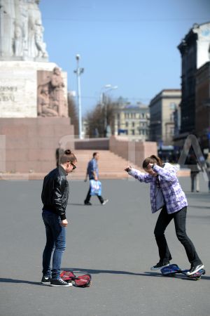Meitenes ar veivbordu pie Brīvības pieminekļa.