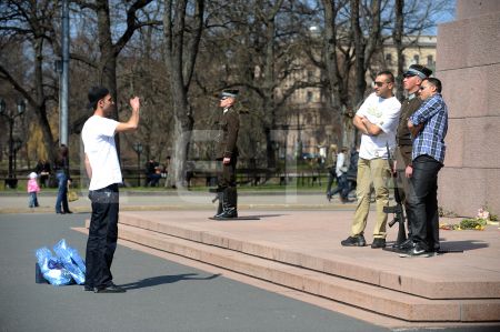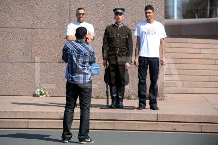 Tūristi fotogrāfējas ar goda sardzi pie Brīvības pieminekļa.