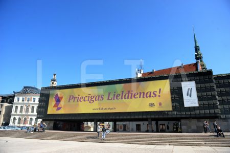 Plakāts ar uzrakstu ''Priecīgas Lieldienas!'' uz Okupācijas muzeja ...