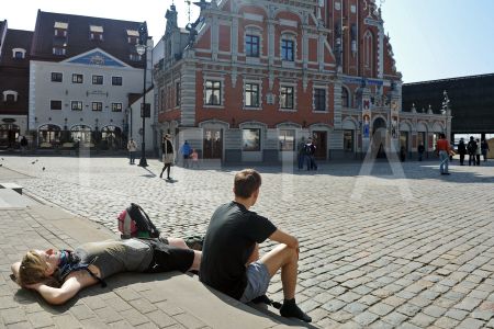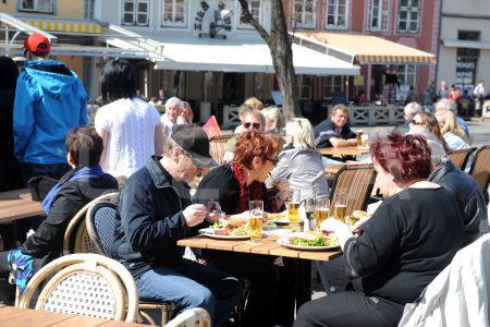 Tūristi vasaras kafejnīcā Līvu laukumā.